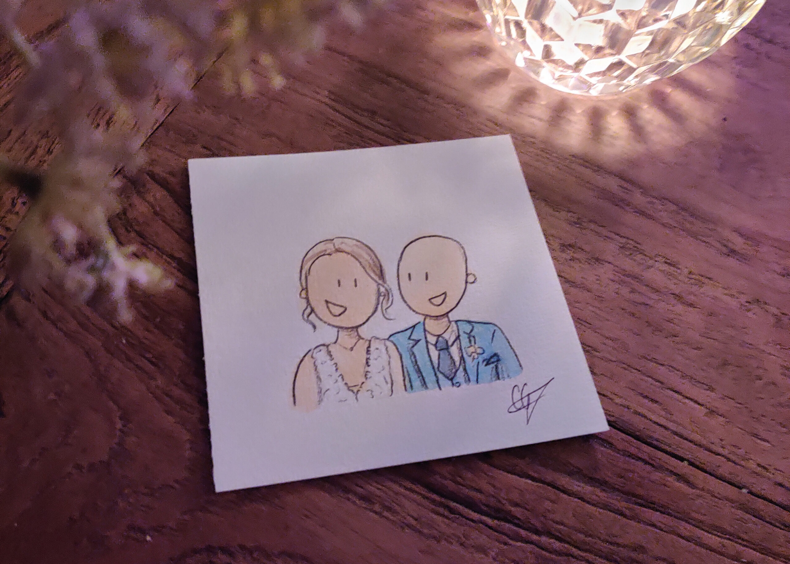 Toen de eerste gasten mijn tafel verlieten en het eindresultaat deelden met de andere aanwezigen, waren er veel positieve reacties. Men herkende de personen en ze waren enthousiast gemaakt om ook van deze bruiloft activiteit gebruik te maken. Leuk! Ik heb gedurende de borrel en het taart-moment zitten illustreren en de gegadigden wisselden zich steeds braaf en om de tien minuten af. Dit is wat ik dan aan de andere kant van de tafel zie, als het klaar is. Ver ingezoomd wel, want afstand natuurlijk.