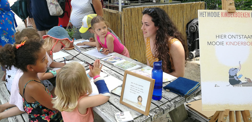 Op 27 mei 2018 mocht ik in de Tolhuishuin te Amsterdam plaatsnemen aan een picknicktafel. Bij de picknicktafel stond een bord met de tekst ‘Hier ontstaan mooie kinderboeken’. Die dag mocht ik werken aan het boek dat ik maak en kinderen een kijkje laten nemen in mijn proces.