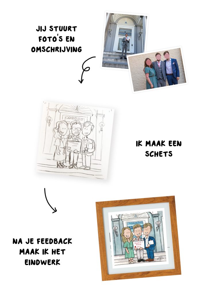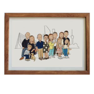 Met veel aandacht aan persoonlijke details, werk ik aan jouw persoonlijk portret. Hierdoor herken je de personen zonder dat de illustratie erg realistisch is.