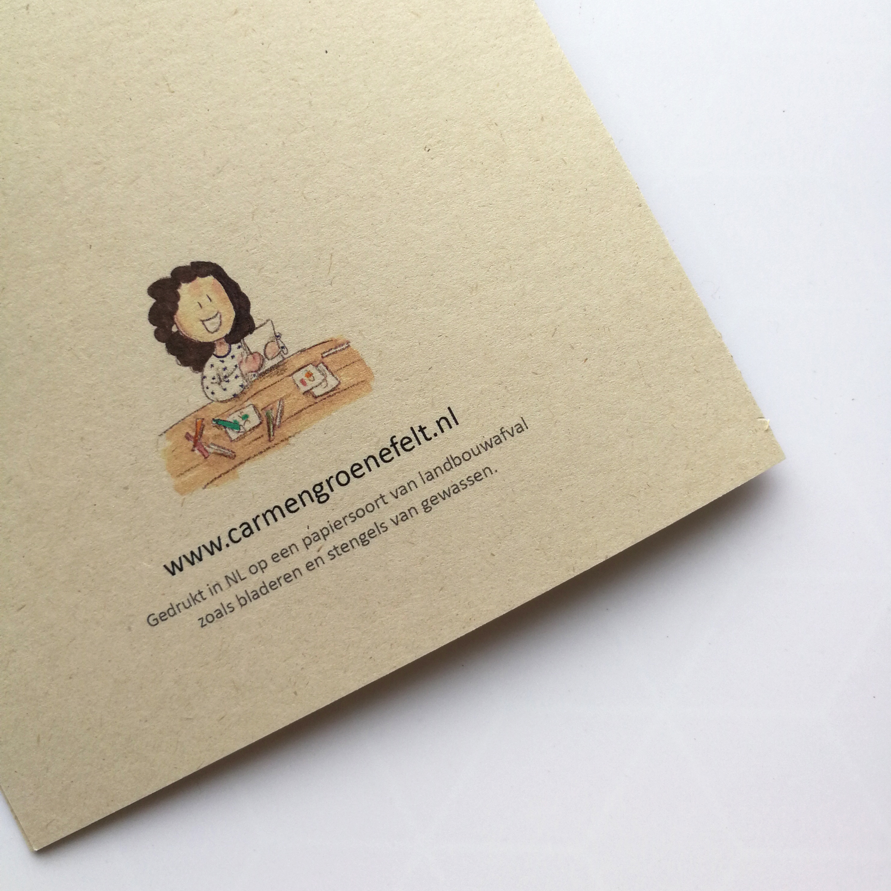 Het speciale aan de kaarten is dat ze werden gedrukt op papier gemaakt van landbouwafval (bladeren en stengels van gewassen). Duurzaamheid vind ik belangrijk en daarom komt het ook door in de producten die ik aanbied. Daarom zijn de kaarten ook blanco en niet té duidelijk ‘kerst’, zodat ze ook voor andere geledenheden gestuurd kunnen worden.
