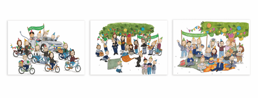 Bij De Groene Boekhouder sturen ze hun klanten wanneer deze jarig zijn een kaartje, met daarop een illustratie van het team. Elk jaar maak ik een illustratie, hierdoor wordt het meest actuele team vastgelegd. Omdat ik zelf klant ben bij ze, ontvang ik elk jaar op 26 juli ook zelf een kaart!