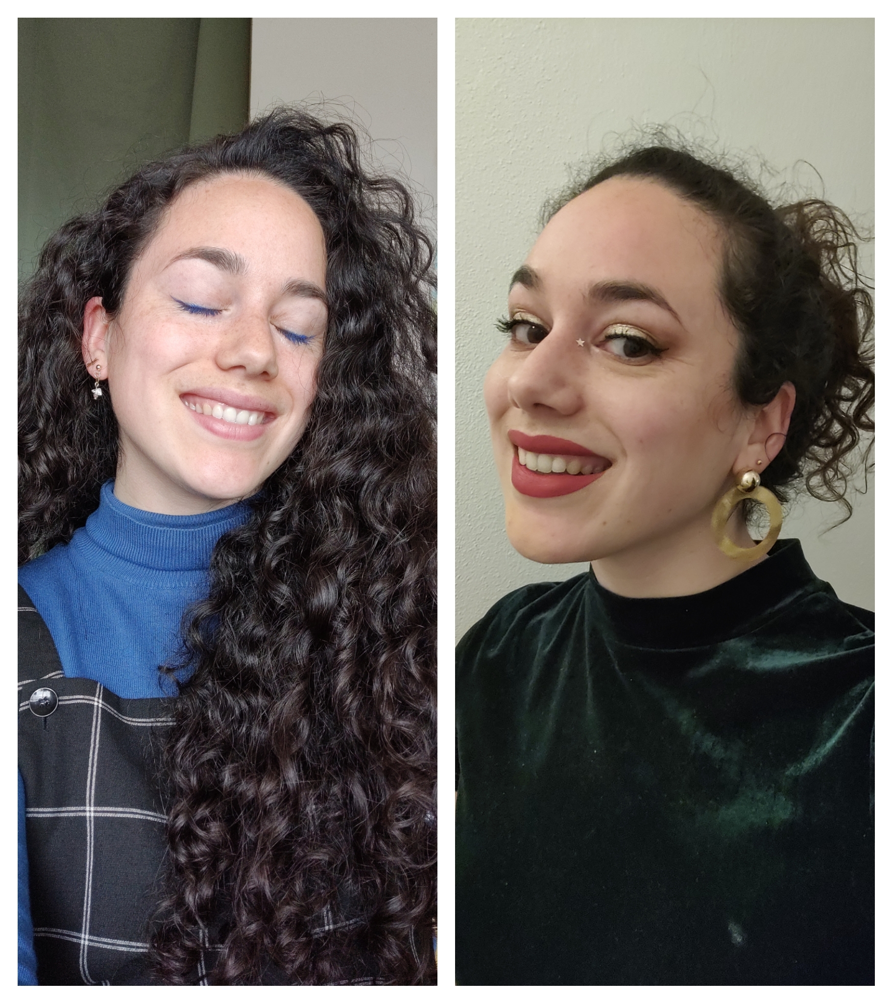 Hierbij een collage voor als ik een snelle illu zou willen van mij met mezelf. Geen probleem dat ik links ‘slecht op de foto sta’ en mijn ogen dicht zijn, op de illu zal ik ze open tekenen en op de rechter foto in de collage heb ik mijn hoofd gedraaid zodat je de krullenknot wat kan zien. Vanwege de minimalistische tekenstijl, zal de make up niet zichtbaar worden in de illustratie.